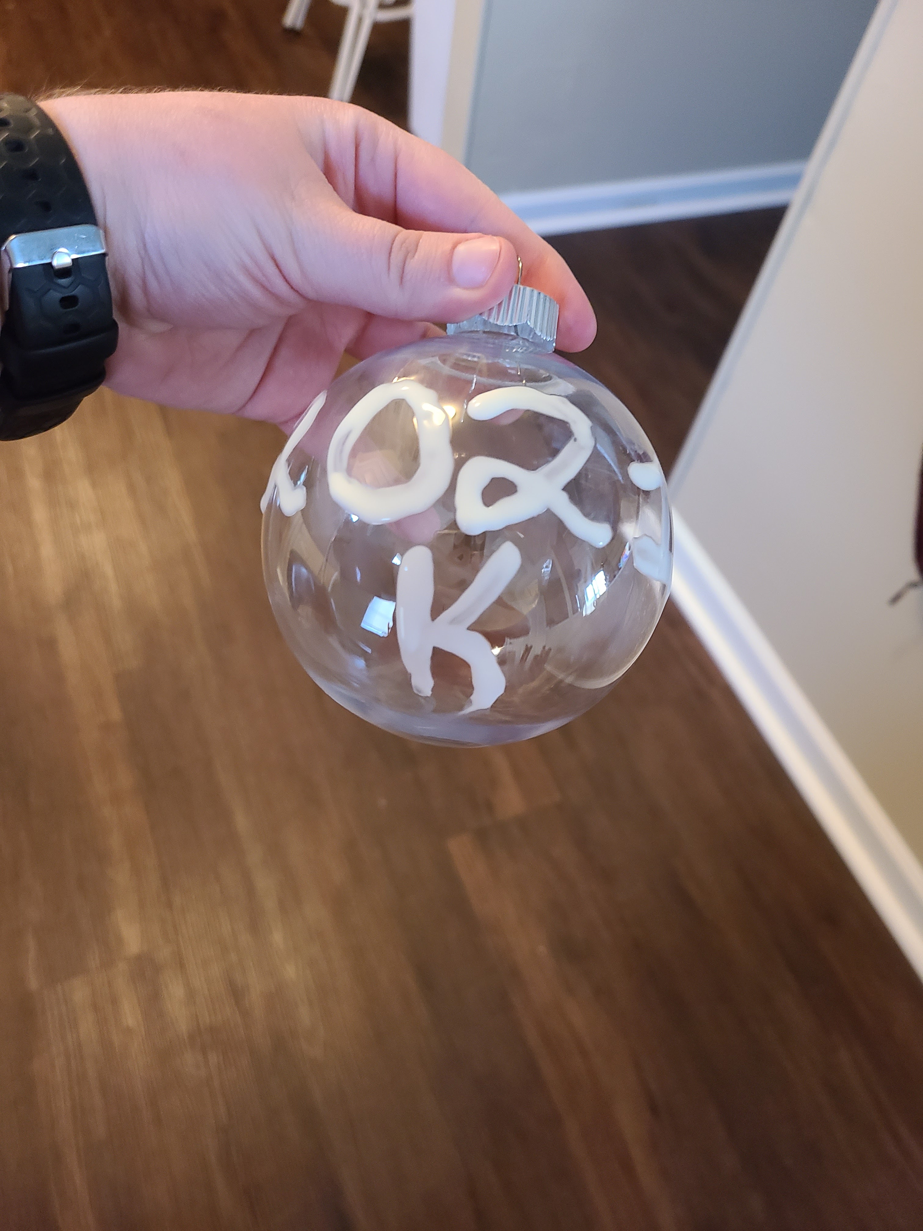 - Take your ornament and Mod Podge. The original idea covered the entire back of the ornament. But I changed this a little to make it more personalized. Instead of covering the entire back, I wrote the year and my initial (I made multiple of these).
