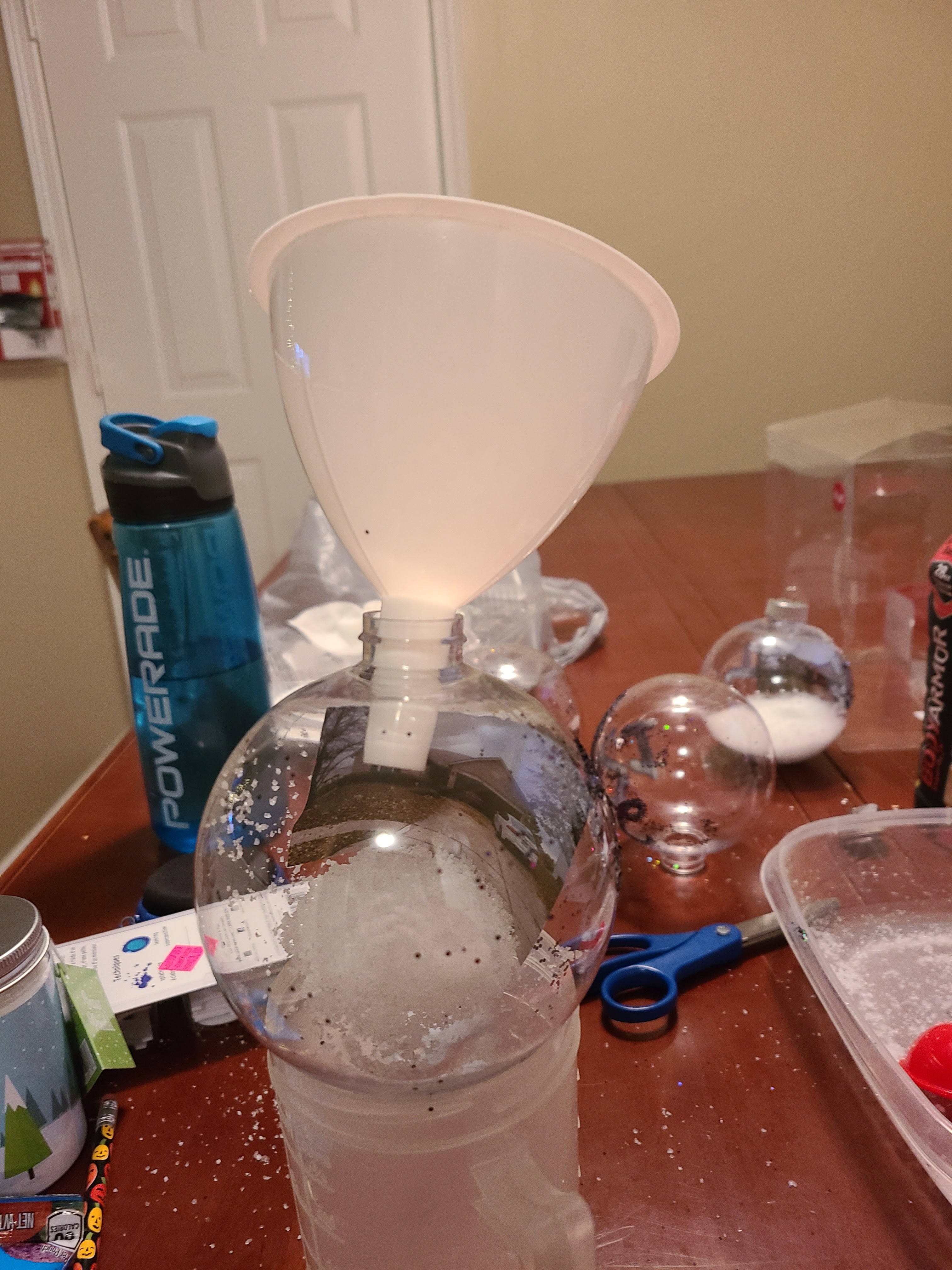 4. Next comes the filling with snow. I set my ornament in a cup and put a funnel in the top. I also turned both the ornament and the funnel on their sides a little bit. Through trial and error, I found that it was easier to keep the photo in place if you started with the snow against the photo so that it was able to be supported without glue or any other adhesive.