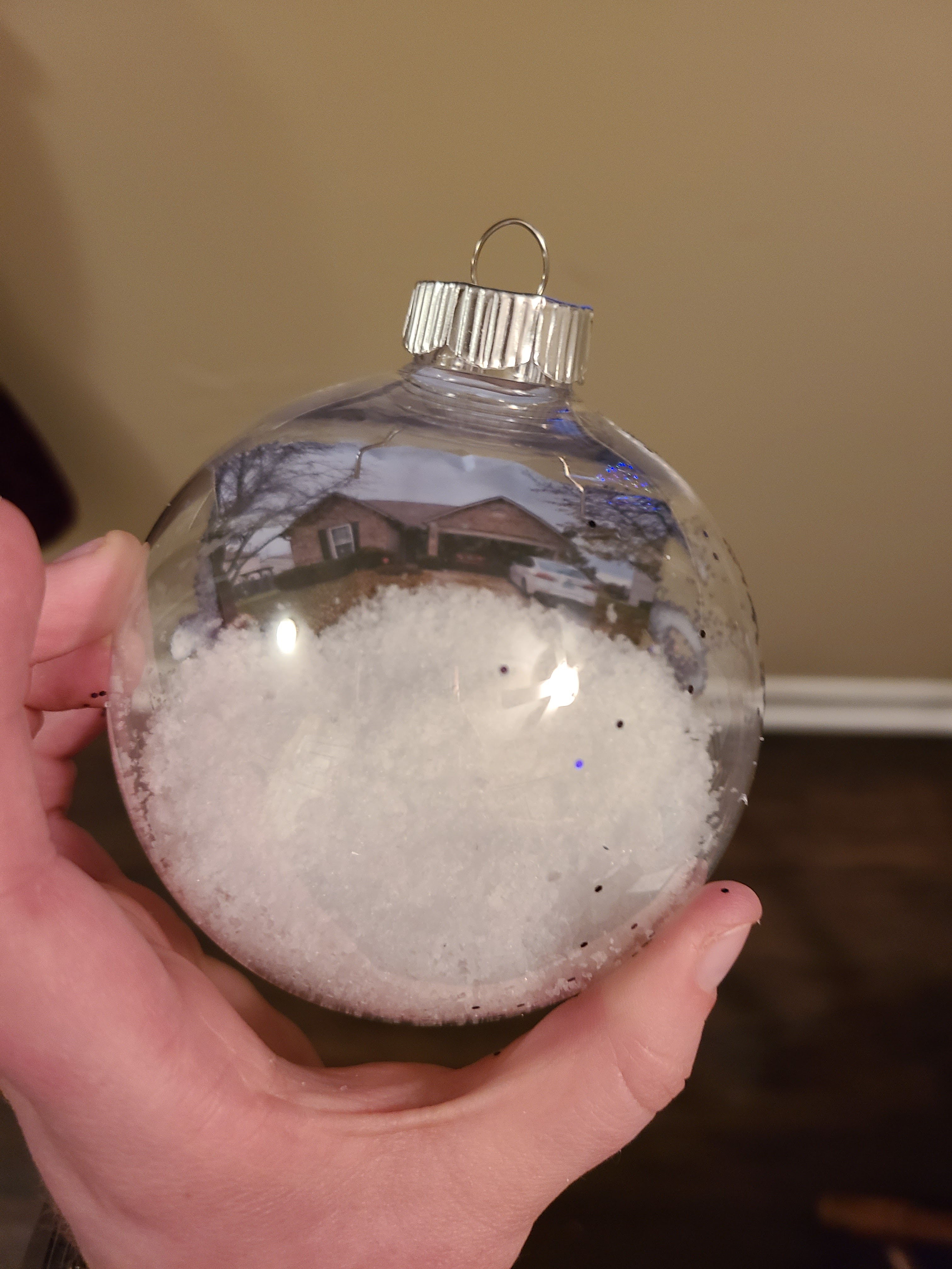 5. Fill with snow until satisfied. There was no specification, and the ornaments I used were bigger than the ones the original link used, so I used more snow than they did.