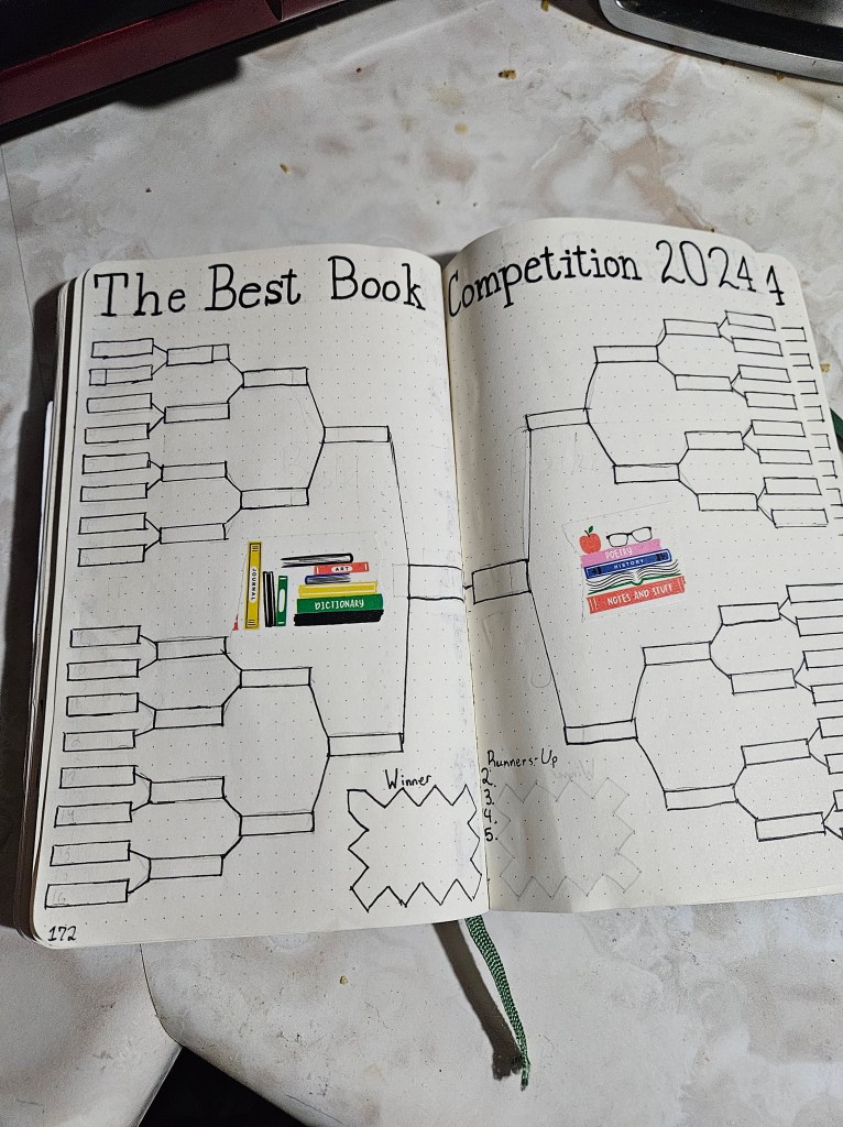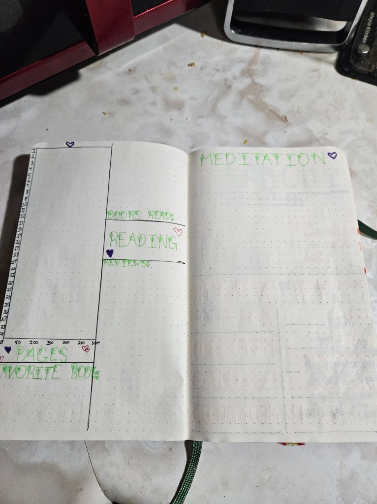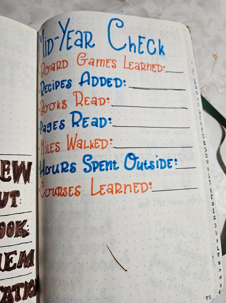 - Year in Review- Monthly reflections (three pages for each month to reflect on the month, what I learned in the self-improvement course, and just any other thoughts and feelings), best book bracket, worst book bracket, goal/tracker reflections (walking, weight, board games, recipe, outside time), cleaning reflection, emotion reflection, project and ideas, notes and mantras, year reflection, and goals for 2025