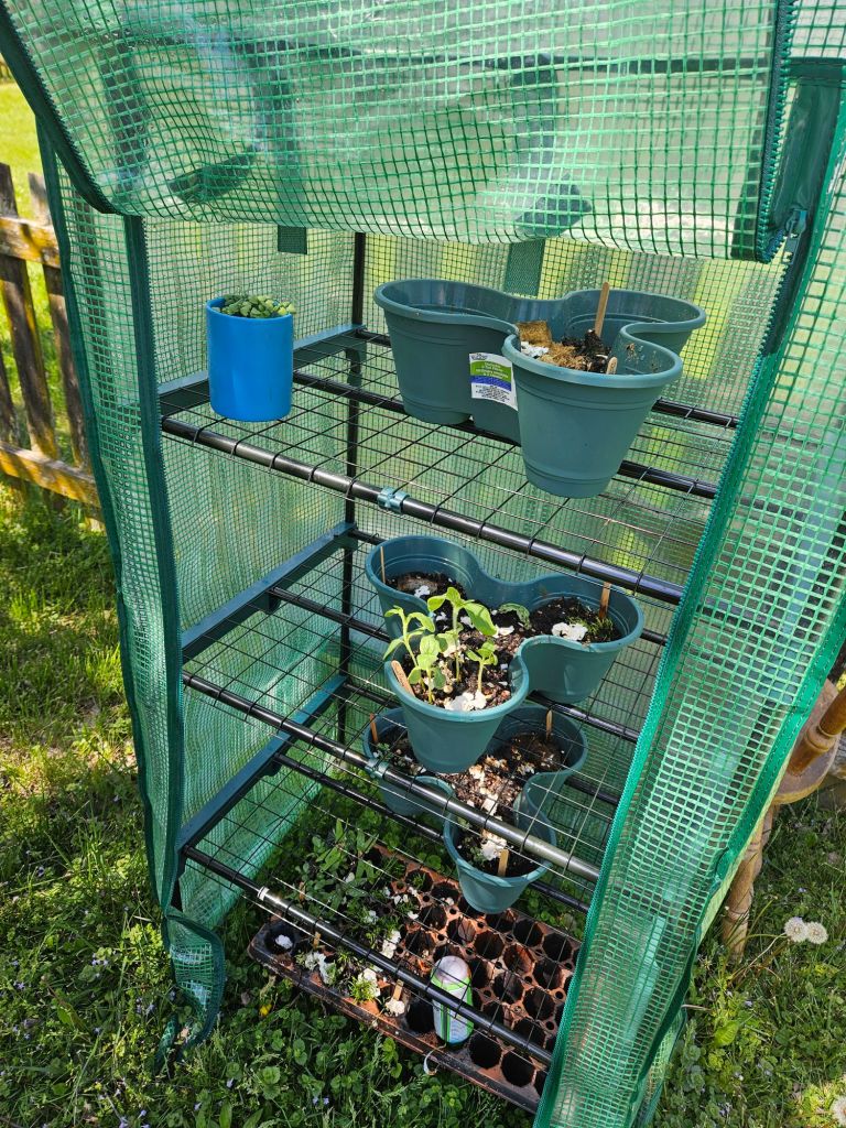First of all, I bought a standing greenhouse from Aldi. (I have become an Aldi lover and shopper for all the things they provide at great prices. I can’t get everything from there that I need, but I can get most food and some other cool products there. I may end up doing a post on Aldi someday.) It zips and has shelves to protect from unwanted parts of the environment– namely pests that would try to eat my plants. The material is thick and durable as well. It’s staked down so it doesn’t blow over when it storms.